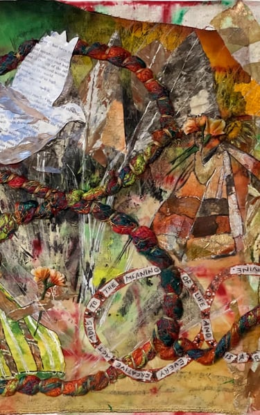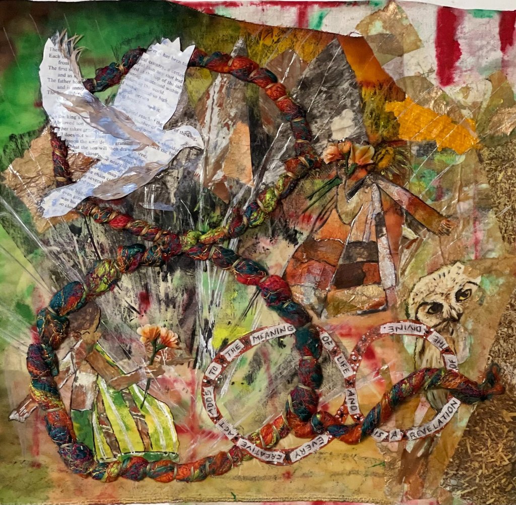 I weave fragments of found paper, paint, and thread to trace the invisible loops that bind memory, ritual, and motion. Braided cords and recurring rings—most often forming the figure eight—become pathways: the eight as symbol of continuity and renewal (endlessness and cyclical return), balance and harmony (two interlocking loops in dynamic equilibrium), and practical transformation (eight as a number of regeneration, rebirth, and material abundance). Women—both as makers and subjects—appear throughout the work, their hands and garments rendered in collage and mark-making to honor traditions of craft, care, and domestic labor in mixed-media practice. Birds and human figures move together as witnesses and companions: avian motifs signal migration, freedom, and the fragile archive of memory. Braids and eights hold moments of flight, grief, and quiet witness—while torn edges and stained surfaces keep history visible and imperfect. The work asks viewers to follow the connections between female presence, animal companions, human gesture, and the stories stitched into everyday detritus, inviting a slow reading of grief and resilience.