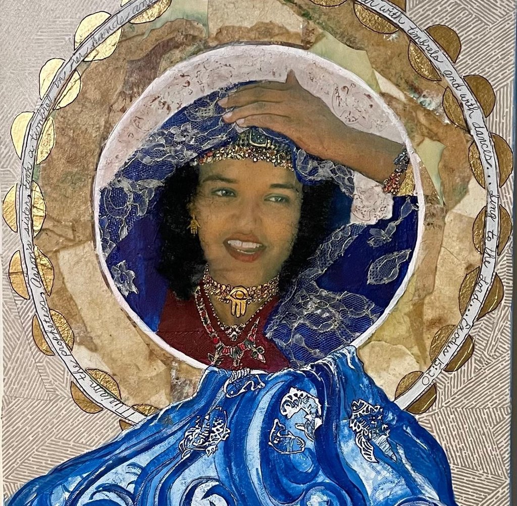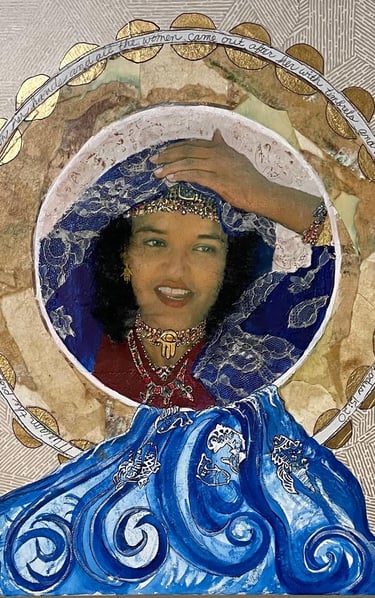 Using acrylics, watercolor, fabric, gelli-printed papers, upcycled wallpaper, ink, gold leaf, and stamping, Miriam emerges as both historical figure and sacred icon—radiant, celebratory, resolute. Her lifted hand gathers a lace-like veil, suggesting motion, ritual, and leadership. Gold leaf evokes sanctity while a ring of handwritten text circles her like a chorus. Stylized blue waves symbolize the parted sea—liberation and passage—while embedded fish signify life and abundance. The tambourine represents rhythm, unity, and prophetic voice; layered textures mirror history and memory, making Miriam a visual hymn to feminine leadership, resilience, and communal joy.